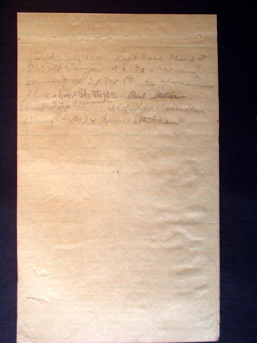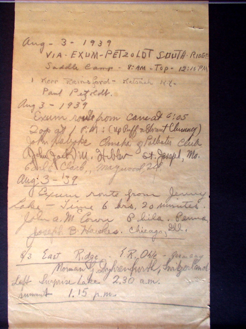 Joe Stettner penned the next entry, too: “Ascent via Owen route by Iowa Mountaineers and Chicago Mountaineering Club,” he wrote. The date of this entry: August 26, 1945.