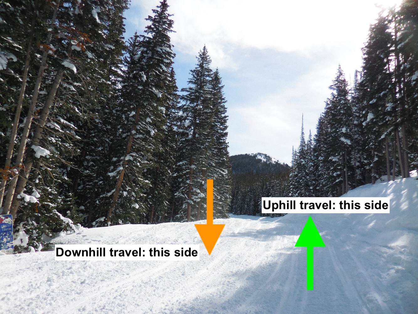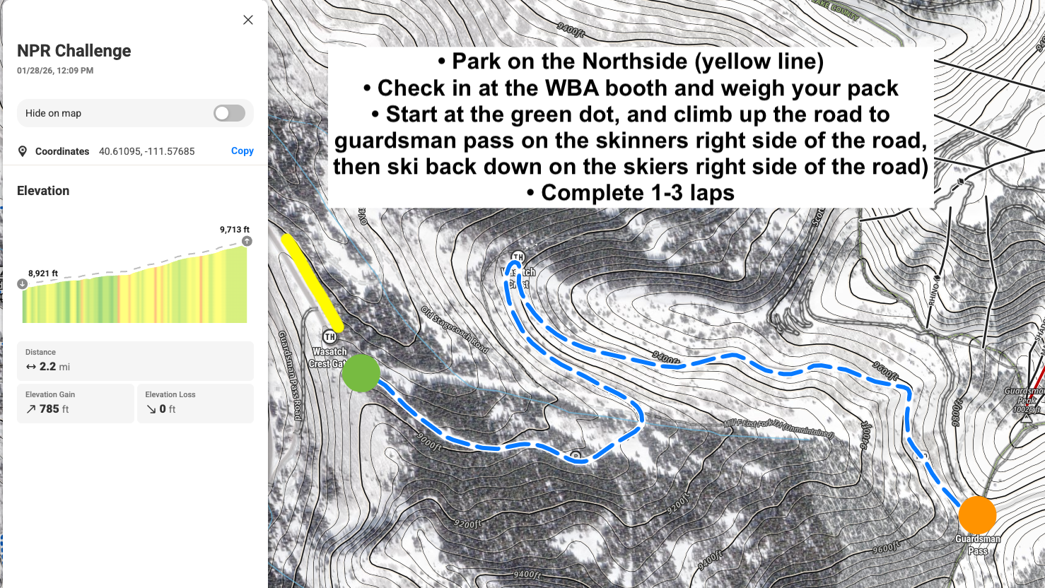 • Start at the green dot (winter gate), and climb up the road to Guardsman pass (orange dot) on the skinners right side of the road, then ski back down on the skiers right side of the road)